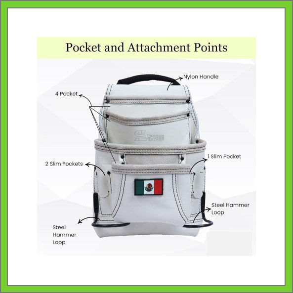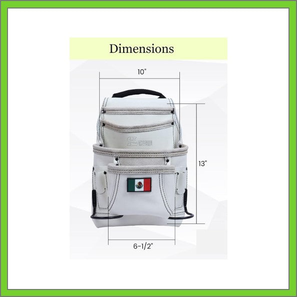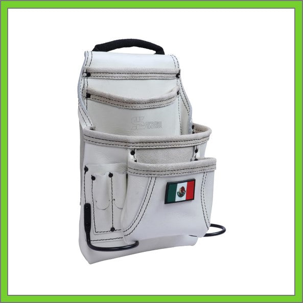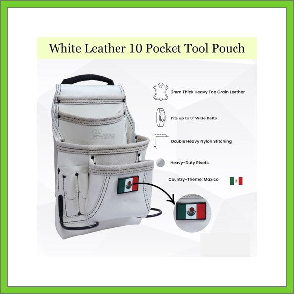 Premium Leather White Tool Pouch with 2 Hammer Holders for Framers, Roofing, Carpenters, Electricians, Construction - 10 Pocket - Mexico Flag