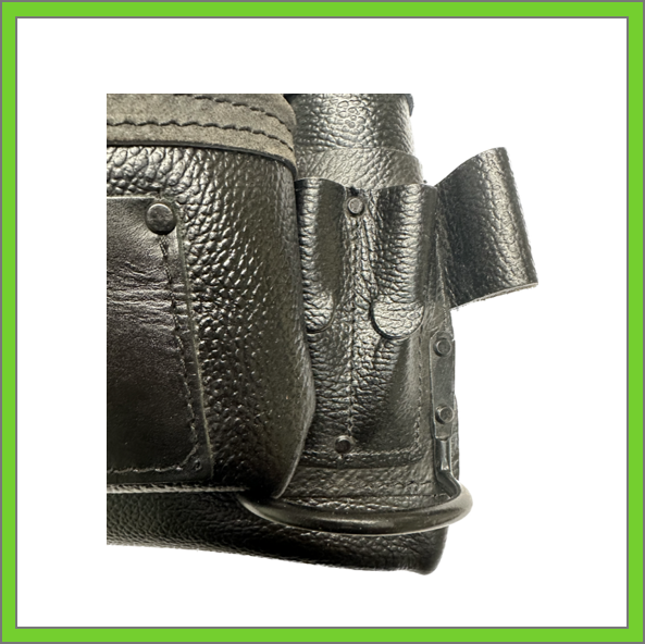 - MULTIPLE TOOL HOLDERS: 2 steel hammer holders and 2 leather pry bar holders.